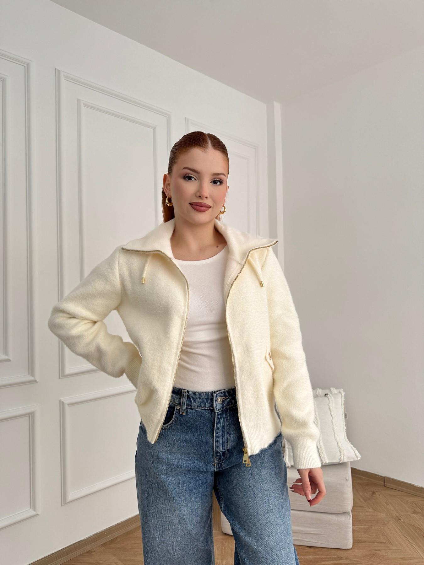 Dik Yaka Fermarlı Yumoş Hırka Vanilya