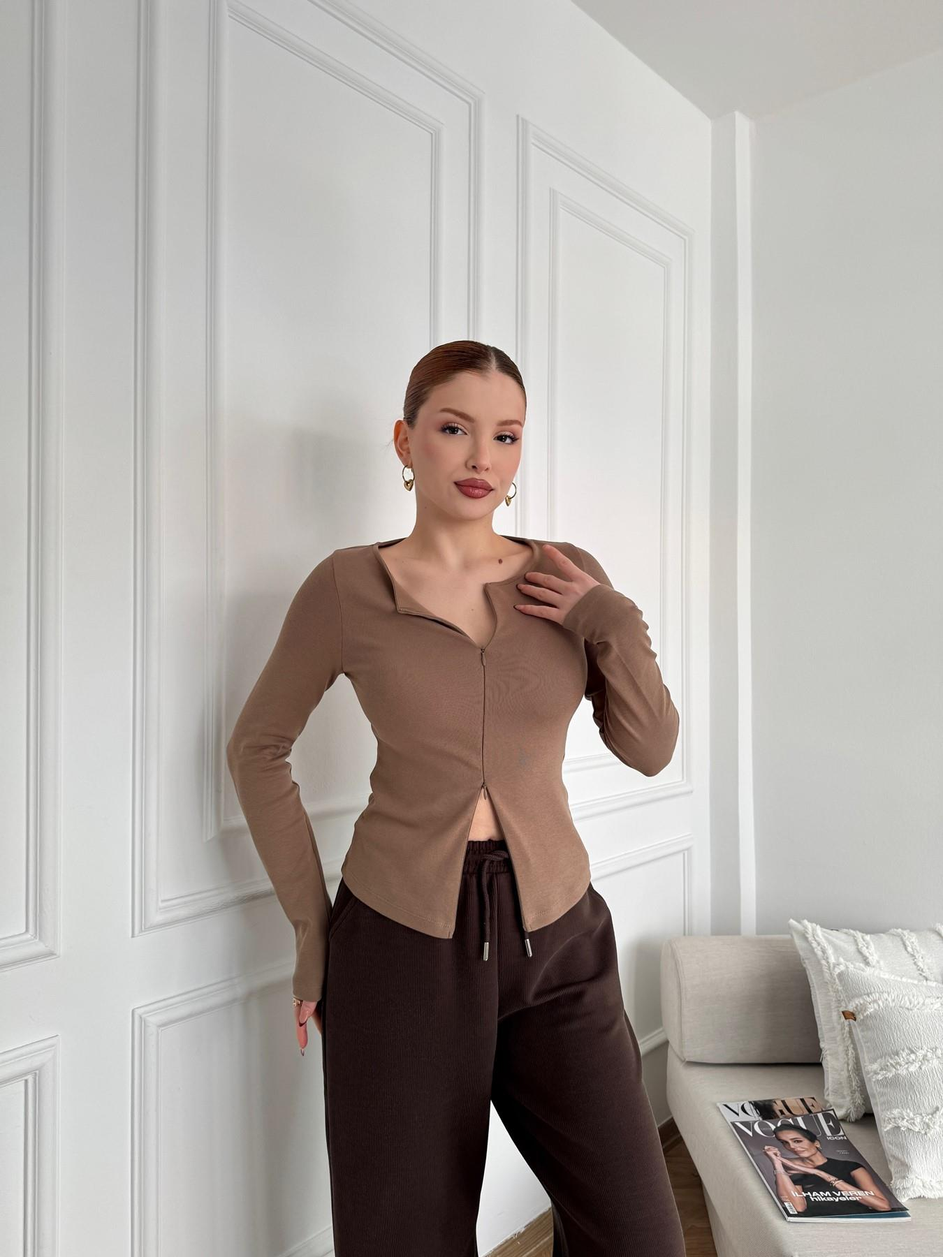 Fermuar Detay Uzun Kollu Bluz Vizon