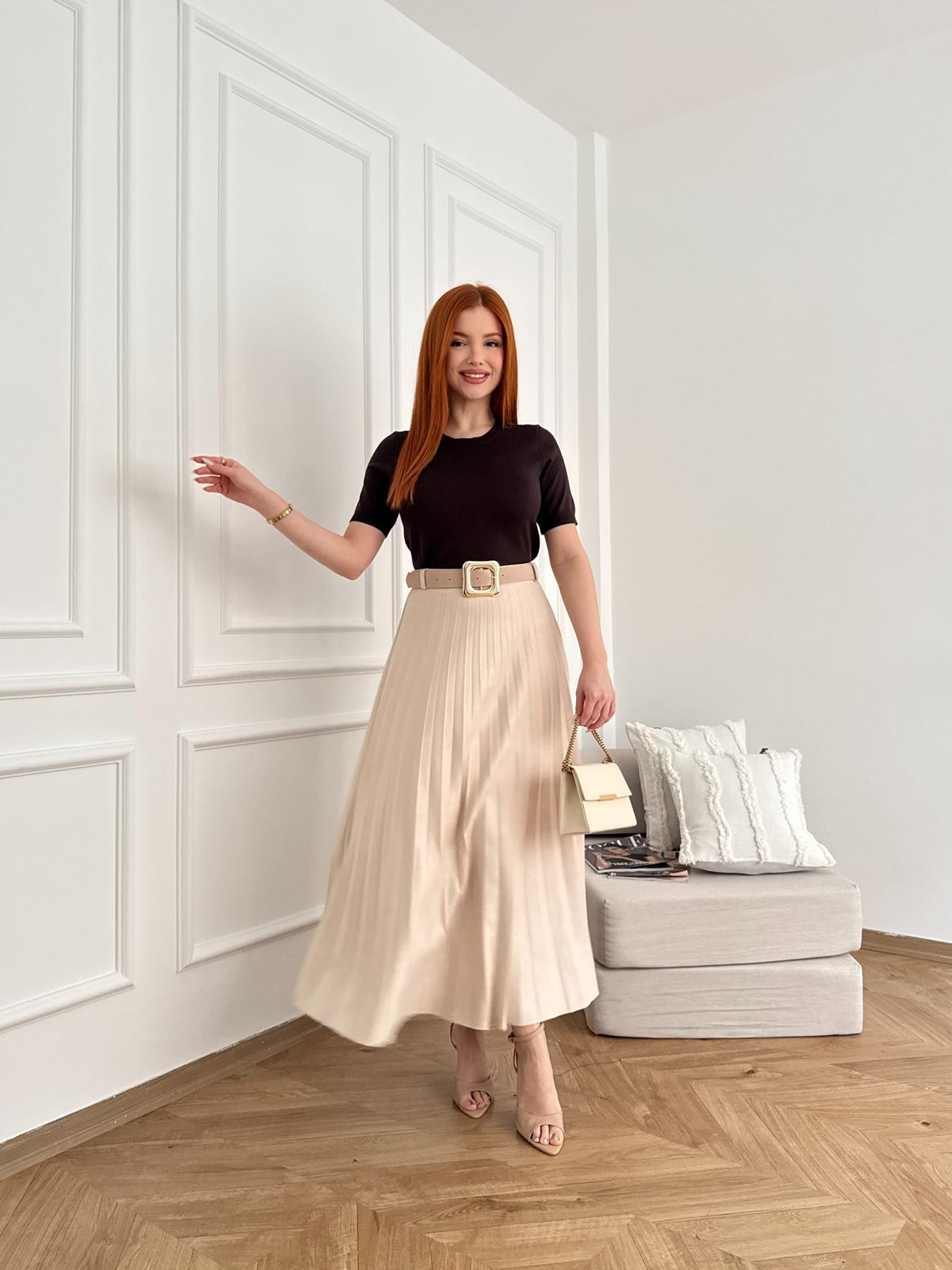 Kemerli Pileli Uzun Etek Ekru
