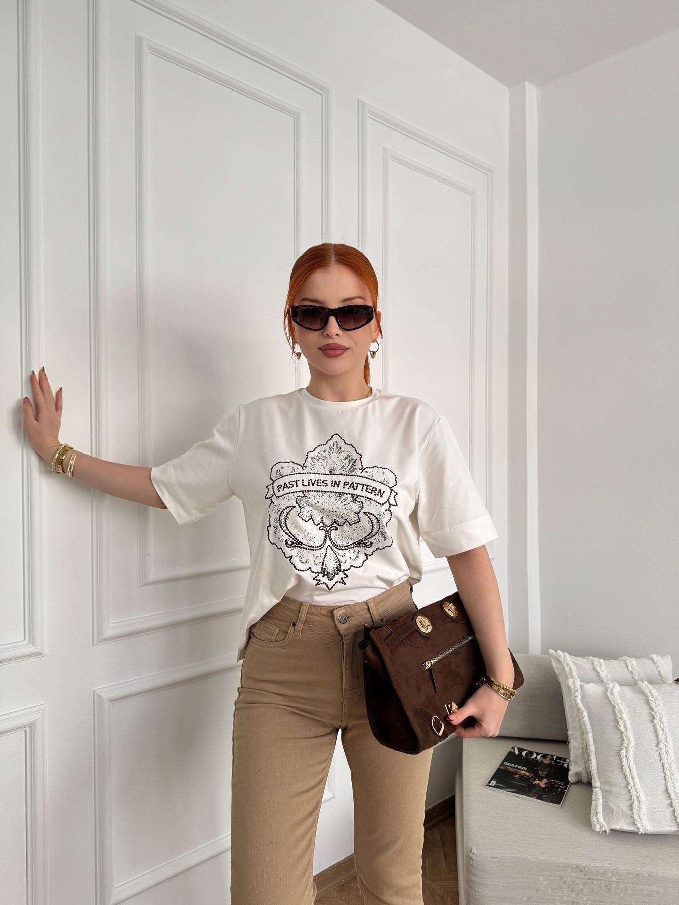 Past Lıves In Pattern Nakışlı Tişört Ekru